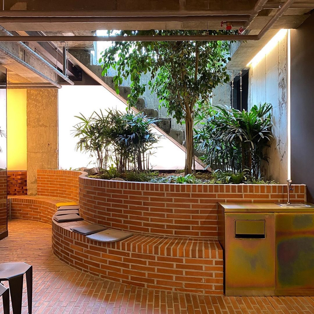 นอกจากจะบริการเครื่องดื่มและขนมอร่อย ๆ ที่มิโนมีส่วนร่วมในการคิดเมนูด้วยแล้ว Osechill ยังโดดเด่นและเป็นที่พูดถึงในแง่ของการออกแบบและสถาปัตยกรรม โดยเอกลักษณ์ที่ชัดเจนของการตกแต่งภายในร้านก็คือการโชว์วัสดุเปลือยทั้งอิฐ กำแพงปูน หรือโต๊ะและเคาน์เตอร์ที่ใช้แผ่นอะลูมิเนียมมาประกอบแบบดิบ ๆ ซึ่งเป็นการตกแต่งที่ฉีกออกมาจากร้านคาเฟ่ทั่วไปของเกาหลีที่เรามักคุ้นเคยกับภาพโทนร้านขาว ๆ เน้นสไตล์มินิมอลอบอุ่น ความดิบที่จุดเด่นของ Osechill ยังเห็นได้จากการจัดสวนกลางร้านที่ดูไม่มีแบบแผน รวมไปถึงการใช้แสงในร้านที่บางจุดก็ใช้แสงนีออนสีจัด ๆ มาสร้างความดรามาติกให้พื้นที่อีก