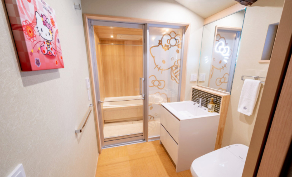 พื้นห้องทุกโซนถูกปูด้วยพรมลายโบว์ คุมโทนด้วยสีน้ำตาลเข้ม ยกเว้นส่วนที่เป็นห้องน้ำ ซึ่งใช้สีขาวสะอาดตา พร้อมสุขภัณฑ์สไตล์โมเดิร์นที่ตัดกับภายนอกแบบฉึบฉับ แถมมีดีเทลคิวต์ ๆ เป็นภาพพิมพ์ Hello Kitty สวมกิโมโนสีชมพูคอยนั่งจ้องหน้าเราระหว่างนั่งโถไปอีก ส่วนฉากกั้นระหว่าง Wet Zone กับ Dry Zone ของห้องน้ำ ก็แน่นอนว่าต้องเป็นกระจกลาย Hello Kitty ที่ทำขึ้นเฉพาะ น่ารักน่าชังอย่าบอกใคร!