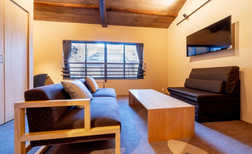 สิ่งที่ดูย้อนยุคไม่ใช่แค่การแต่งองค์ทรงเครื่องของน้อง Hello Kitty เท่านั้นหรอกนะ แต่เป็นที่มู้ดแอนด์โทนของห้องพักเองด้วย โดยภายในห้องธีม Maiko Hello Kitty จะเน้นโครงสร้างและเฟอร์นิเจอร์ไม้สีเข้มเป็นหลัก ดูอบอุ่นเคร่งขรึมทั้งโซนนั่งเล่นและโซนห้องนอน ซึ่งมีทั้งเตียงเดี่ยวและเตียงคู่วางอยู่ด้วยกัน