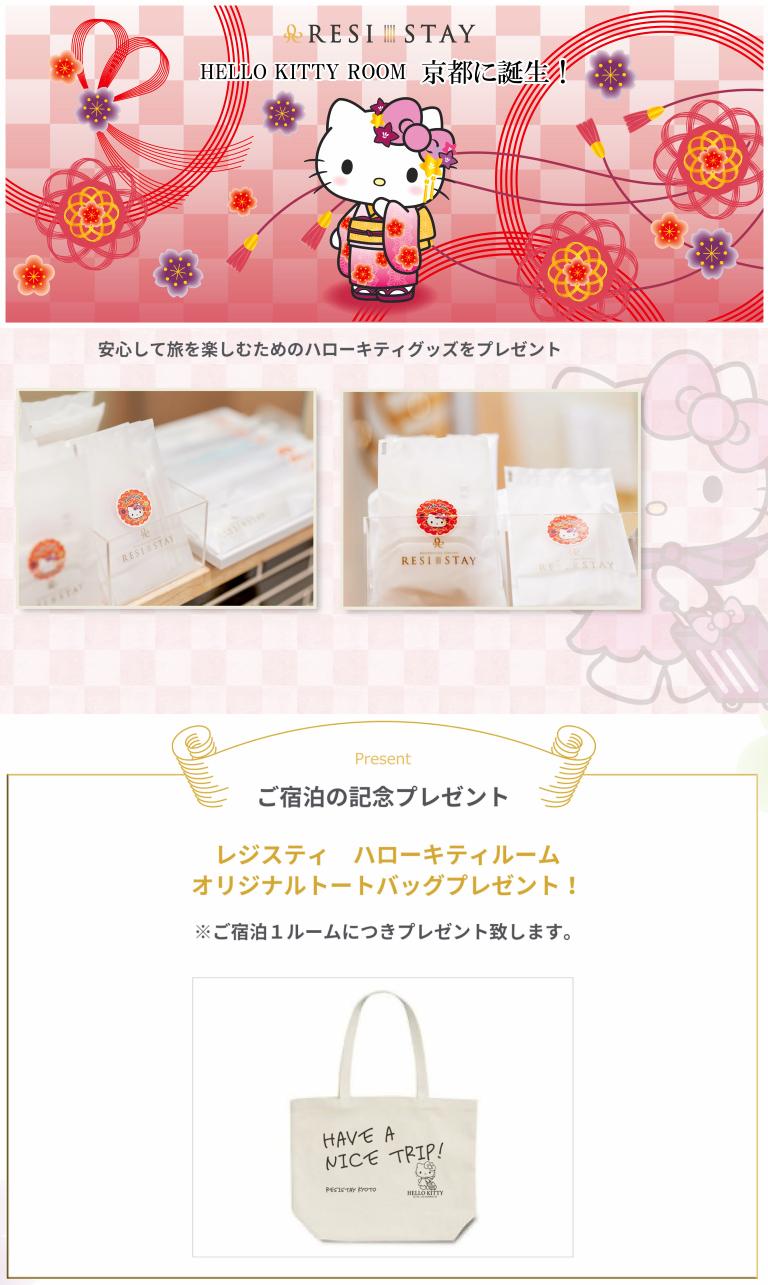 ผู้เข้าพักห้อง Maiko Hello Kitty ของ RESI STAY Nishiki จะได้รับกระเป๋าผ้า ขณะที่อุปกรณ์เครื่องใช้ต่าง ๆ ในห้องก็จะติดฉลาก Hello Kitty กลายเป็นของที่ระลึกไปในตัวด้วยเลย ใครที่อยู่ญี่ปุ่นตอนนี้แล้วอยากแวะไปพัก สามารถ (รีบไป) จองได้เลยที่เว็บไซต์ resistay.jp/kittyroom ในราคาคืนละ 22,700 เยน หรือประมาณ 6,500 บาท คิวอาจจะยาวหน่อย แต่คุ้มค่าความน่ารักแน่นอนจ้า!