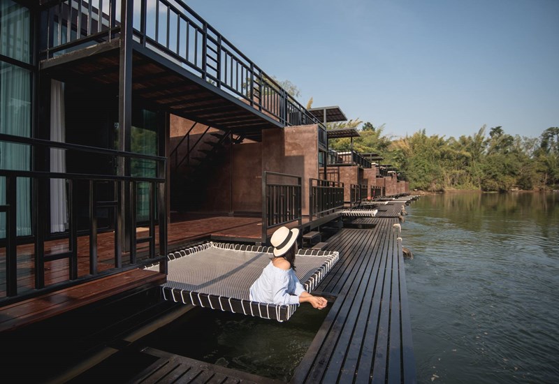 ห้องพักริมน้ำสุดเท่สไตล์ industrial ริมแม่น้ำแควน้อยทั้ง 22 ห้องกินขาดรีสอร์ทอื่นๆ ในเรื่องการออกแบบที่ใชทั้งเหล็กผสมกับไม้และกระจกออกมาเป็นห้องพักริมน้ำที่เท่ทั้งห้องและมุมมองของวิว โซนใหม่อย่าง XFloat Cabins มาพร้อมกับชั้นดาดฟ้าที่มองเห็นวิวตั้งแต่เช้าจรดพระอาทิตย์ตกดิน ราคาเริ่มต้น 3,579 บาทสำหรับห้อง Luxe Cabin ที่มาพร้อมกับ terrace ยื่นออกมาชมวิวริมแม่น้ำได้เลย