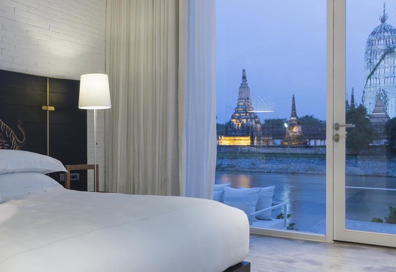 โรงแรมสุดเท่ริมฝั่งแม่น้ำเจ้าพระยาชนะใจเราด้วยการออกแบบห้องสไตล์มินิมอลโมเดิร์นแต่เต็มไปด้วยดีเทลวันวานอย่างกำแพงอิฐที่จำลองมาจากโบราณสถานที่อยู่ในจังหวัดอยุธยา นอกจากจะอยู่ริมแม่น้ำแล้ว โรงแรมยังมองเห็นวิวสวยของวัดพุทไธสวรรค์ที่ตั้งอยู่ฝั่งตรงข้ามด้วย ราคาเริ่มต้น 4,500 บาท พร้อมจักรยานให้เช่าฟรี
