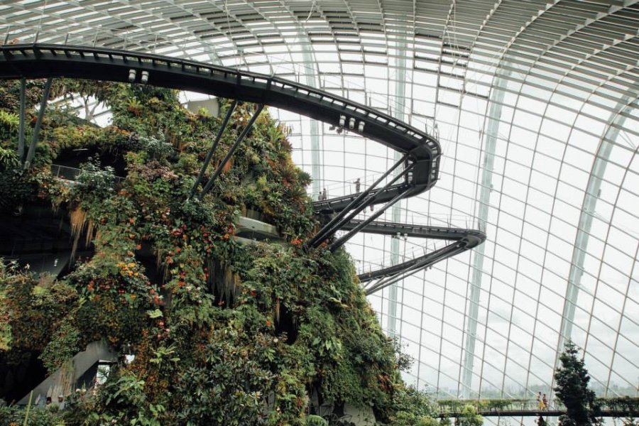 และอีกโดมที่อยู่ติดกันคือ Cloud Forest (เปิดทุกวัน 09.00-21.00 น.) ซึ่งเลียนแบบสภาพภูมิอากาศเย็นชื้นบนภูเขาในประเทศเขตร้อน ไฮไลท์เด็ดอยู่ที่น้ำตกสูงกว่า 42 เมตรซึ่งส่งความเย็นสดชื่นต้อนรับเราตั้งแต่ก้าวแรก เมื่อเข้าไปแล้วยังไงก็ต้องขึ้นลิฟต์ไปบน Cloud Mountain เราชอบทางลาดสำหรับเดินลงซึ่งค่อยๆ ม้วนตัวลงสู่พื้น และระหว่างเดินเรายังได้เห็นวิวสุดไอคอนนิกของเรือคาสิโนบนยอดตึก Marina Bay Sands ด้วย