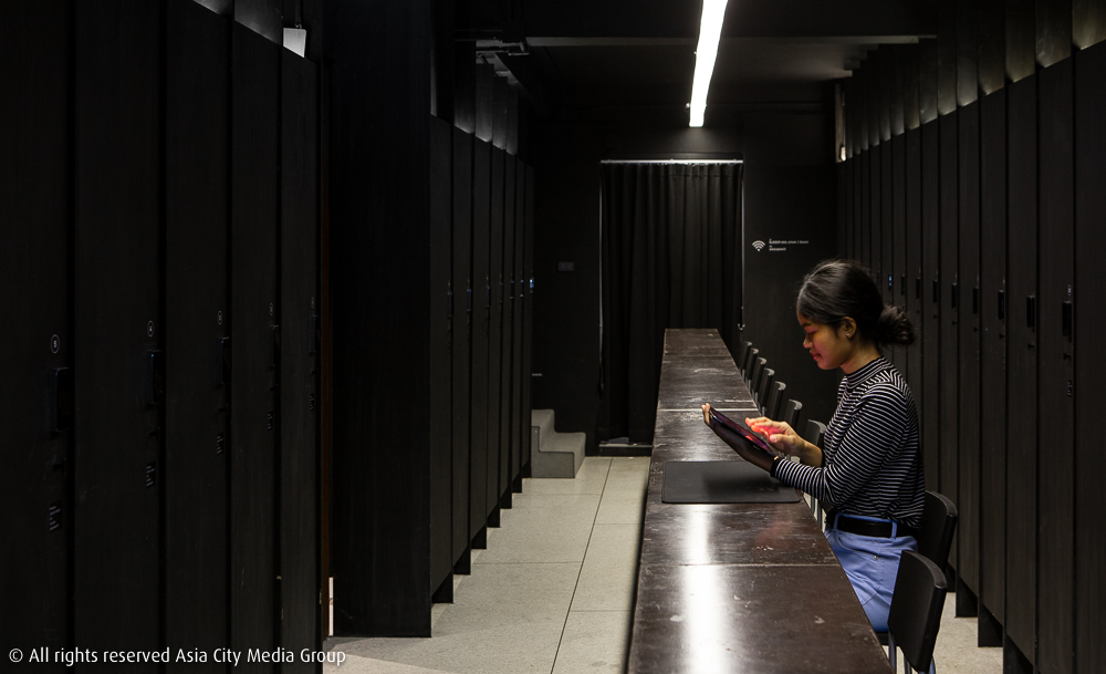 เริ่มจากจุดเช็กอิน ล็อบบี้ทรงวงรีที่ปูกำแพงและพื้นด้วยอิฐ ความดิบ ความหยาบนี้เป็นเหมือนจุดสตาร์ตของทุกสิ่ง โดยเราจะได้รับรหัสล็อกเกอร์ และหมายเลขเตียงจากสตาฟ เพื่อไปยังชั้น 2 ซึ่งเป็นชั้น Co-working Space ที่สามารถนั่งทำงานกันได้อย่างไม่เคอะเขิน แม้จะอยู่ในพื้นที่ที่จำกัด ภายในล็อกเกอร์จะมีสลิปเปอร์ให้เปลี่ยน ผ้าเช็ดตัว 2 ผืน สำหรับอาบน้ำ และกระเป๋าใบเล็ก เมื่อเปลี่ยนรองเท้า ชำระล้างร่างกาย และเคลียร์ธุระปะปังทุกอย่างเสร็จเรียบร้อยแล้วก็เตรียมตัวเข้าสู่การนอนได้เลย