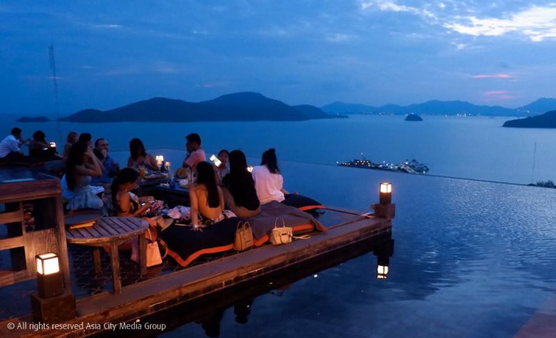 บาร์โอเพ่นแอร์กับวิวหลักล้านแบบ 360 องศาแห่งนี้ถือกำเนิดขึ้นมาเมื่อไม่นาน โดยเปิดให้แขกทั้งจากรีสอร์ตและจากด้านนอกได้เข้าใช้บริการ (ซึ่งจองคิวล่วงหน้ากันเกือบ 2 เดือน) โดยมีความพีคอยู่ที่วิวพระอาทิตย์ในช่วงก่อนพลบค่ำปลายขอบฟ้า ตัดกับความกว้างของทะเลอันดามันแบบสุดลูกหูลูกตา ล้อมรอบด้วยสระว่ายน้ำแบบ Infinity Pool ขนาดใหญ่
