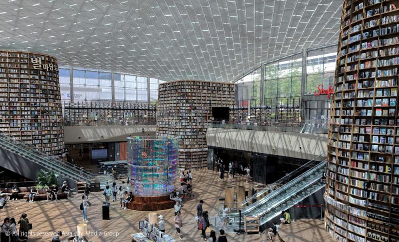 ที่จริงแล้วสถานที่นี้ก็ตั้งอยู่ในห้างสรรพสินค้าเหมือนกัน และน่าจะเป็นที่รู้จักของนักท่องเที่ยวชาวไทยอยู่แล้ว แต่ก็ขอหยิบมาบอกอีกสักทีก็แล้วกัน สถานที่แห่งนี้มีชื่อว่า Starfield Library ตั้งอยู่ในศูนย์การค้า COEX ในกรุงโซล ย่สนกังนัม หรือห้องสมุดที่ชาวเกาหลีเรียกกันว่า พยอนมาดัง โทซอควัน (별마당 도서관) ซึ่งเปิดมาได้สองปีกว่าแล้ว ที่นี่ถือเป้นห้องสมุดที่แรกที่ตั้งอยู่ในศูนย์การค้า และเป็นห้องสมุดเปิดที่ไม่มีค่าใช้จ่ายในการใช้บริการแต่อย่างใด ที่นี่มีหนังสือมากกว่า 50,000 เล่ม ซึ่งไม่แปลกที่จะหาหนังสือที่ต้องการไม่เจอ แต่เราก็สามารถไปสอบถามเจ้าหน้าที่ที่เคาน์เตอร์ได้นะ ส่วนใครที่สงสัยว่าแล้วเราจะหยิบหนังสือเล่มที่ตั้งอยู่บนชั้นสูง ๆ ได้อย่างไร ขอบอกว่าไม่ต้องห่วง หนังสือที่เราเอื้อมไม่ถึง เป็นหนังสือปลอมที่ใช้ตกแต่งสถานที่เฉย ๆ จ้า