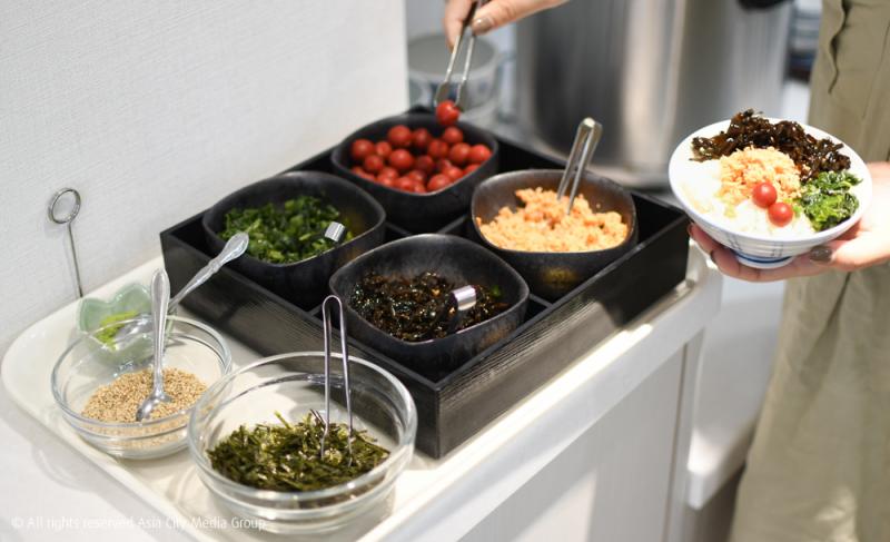 ไลน์อาหารเช้าของที่นี่ก็มีความเก๋ไม่เหมือนที่อื่นเช่นกัน เพราะนอกจากไลน์บุฟเฟ่ต์ American Breakfast ธรรมดา (แต่อร่อยมาก) แล้ว ที่นี่ยังมีเมนูข้าวต้มชาเขียวที่เรียกว่า Ochazuke ไว้ให้ซดร้อน ๆ แทนมื้อเช้าอีกด้วยนะ วิธีทำก็ง่ายมาก ๆ แค่ตักข้าวสวยญี่ปุ่นใส่ชามพอประมาณ แล้วแอ๊ดท็อปปิ้งอย่างสาหร่าย ลูกบ๊วยดอง งาขาว และเนื้อปลาตามใจชอบ อย่าลืมตักน้ำซุปชาเขียวราดลงไปด้วย ส่วนทีเด็ดอยู่ที่การกินคู่กับวาซาบิหอม ๆ ให้รสชาติที่ไม่เหมือนข้าวต้มไทย