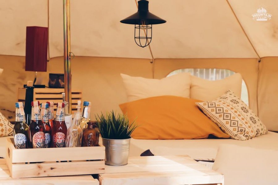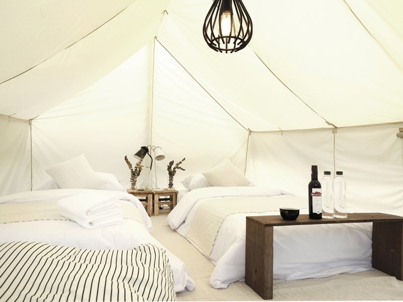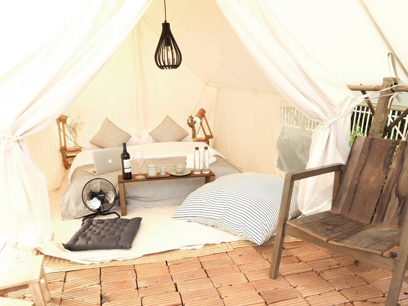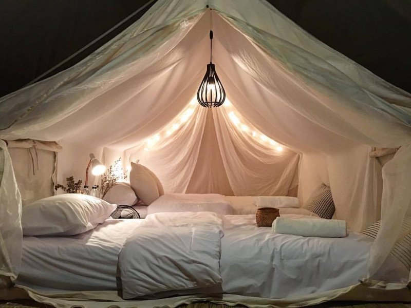 กิจกรรมที่ว่านี้จัดขึ้นเฉพาะวันศุกร์และเสาร์ ช่วงเดือนพฤศจิกายน ถึงเดือนกุมภาพันธ์เองนะ โดยเต้นท์ที่พักจะเป็นสีขาวสไตล์โบฮีเมี่ยน สามารถนอนได้ 2 คน เราชอบที่ด้านหน้าของเต็นท์จะมีเก้าอี้ชายหาดวางคู่ให้ออกไปนอนเอกเขนกรับไอเย็นกันให้ฟิน แถมยังสามารถไปเล่นซิปไลน์ โรยตัว และมีจักรยานให้ปั่นเล่นเพลินๆ อีกด้วย แต่ว่าห้องน้ำของที่นี่เป็นแบบรวมล่ะ