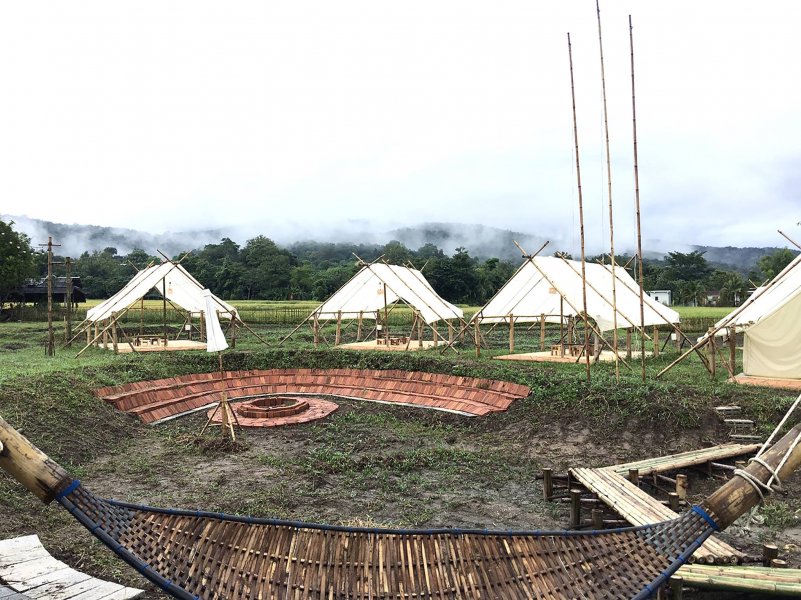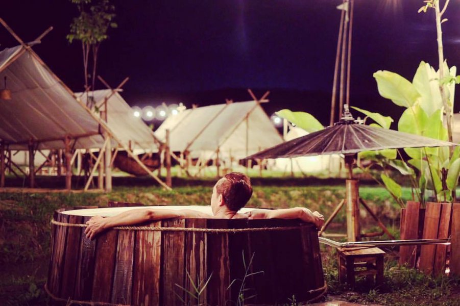 ในตอนนี้มีทั้งหมด 25 หลัง ใน 3 หมู่บ้าน (บ้านต้นไม้ บ้านน้ำ และบ้านพระอาทิตย์) แต่ถ้าช่วงต้นๆ เดือนมกราจะสร้างเพิ่มเป็น 40 หลัง ซึ่งภายในแต่ละห้องก็จะมีเครื่องอำนวยความสะดวกให้พอประมาณ อย่างเช่นพัดลมจิ๋ว เตาไฟฟ้า และ Wi-Fi นอกจากนั้นที่แคมป์ยังมีส่วนสันทนาการให้นั่งเล่น นอนเปล เล่นชิงช้าหรือของเล่นจากไม้ จะเที่ยวชมสวนผักก็ยังได้ แถมยังมีอ่างอาบน้ำร้อนกลางแจ้งที่จะเปิดบริการเวลากลางคืน ให้เราได้ใกล้ชิดธรรมชาติแบบสุดๆ ไปเลย