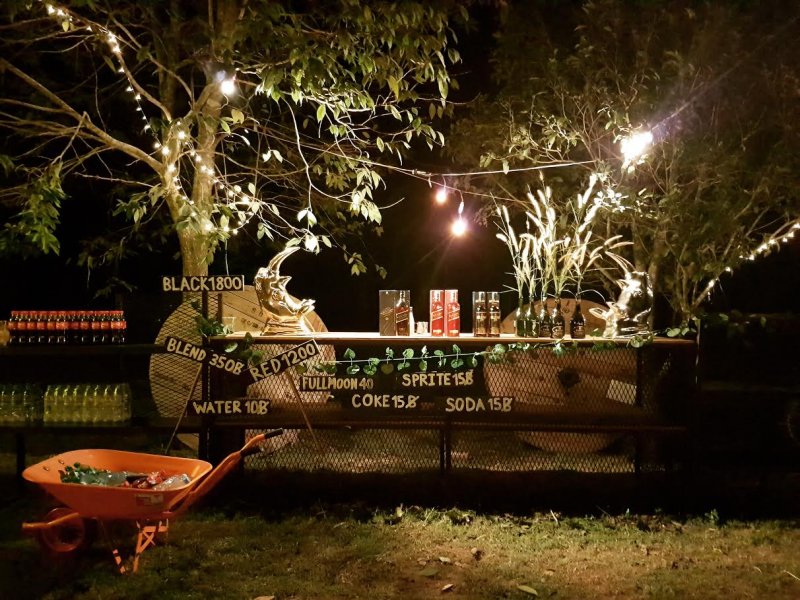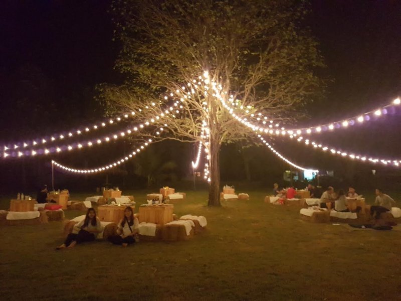 ตอนกลางคืนก็จะเปิดไฟที่ประดับประดาไปรอบๆ มีโยงจากต้นไม้ด้วยนะ ช่วงมื้อเย็นจะมีบุฟเฟ่ต์อาหารไทย มีสลัดและผลไม้ ให้นั่งหม่ำกันบนกองฟางใต้แสงไฟ แต่ถ้ายังไม่จุใจ อยากหาอะไรใส่ท้องเพิ่มก็ไปจัดบาร์บีคิว (40 บาท/ไม้) กันได้เลย มีทั้งหมู ไก่และเนืั้อเลยล่ะ
