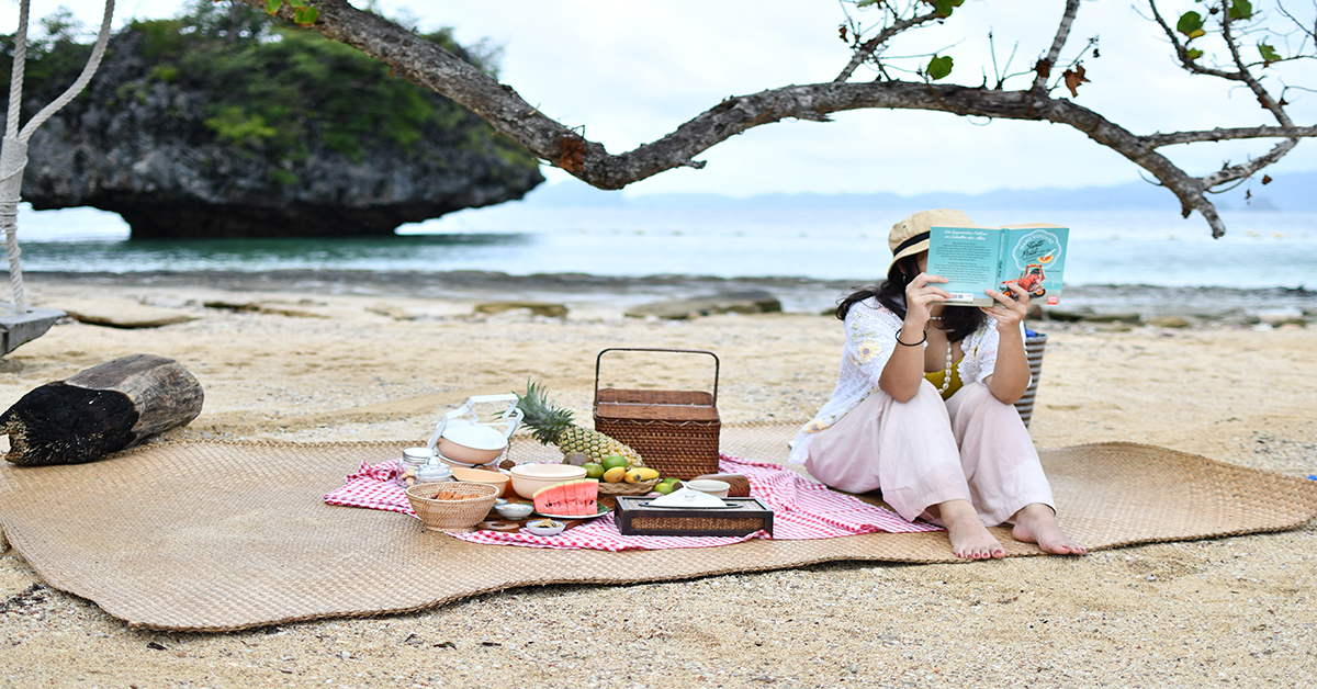 และถึงแม้ว่าห้องพักจะน่าฝังตัวอยู่ทั้งวันทั้งคืนแบบไม่อยากออกไปจากที่นี่ขนาดไหนก็ตาม แต่แรงดึงดูดของกิจกรรมพิเศษต่าง ๆ ที่ทางเดอะทับแขกเตรียมไว้ให้ ก็ดึงให้เราอยากรีบเปลี่ยนชุดสวย ๆ ออกมานั่งเอ็นจอยมื้อพิเศษก่อนอาหารค่ำไปกับเซตปิกนิก Private Picnic By The Beach (2,000 บาท) ริมชายหาดส่วนตัว ที่มาพร้อมเครื่องดื่มและขนม ซึ่งถูกจัดวางอยู่ใต้ซุ้มแสนโรแมนติกและเบาะ bean bag น่าทิ้งตัว ให้เราได้ดื่มด่ำโมเมนต์พระอาทิตย์ตกดินริมหาดไปกับคนรู้ใจแบบสองต่อสอง
