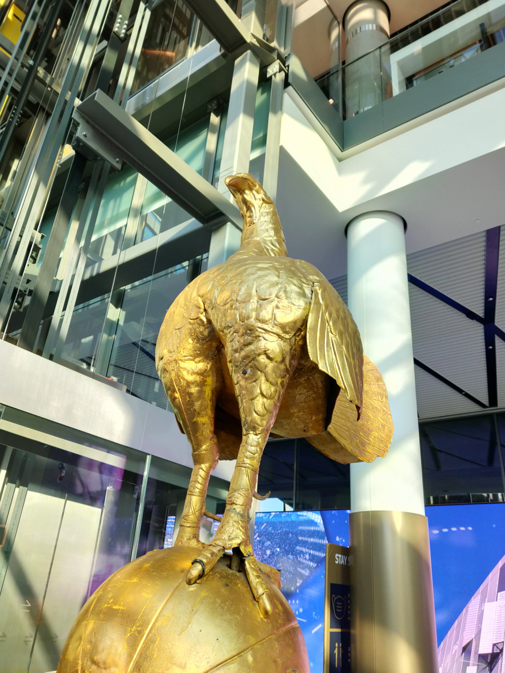 ยังไม่ทันเดินถึงโซนที่เป็นที่นั่งของเรา ก็เจอเข้ากับ Centre Spot หมุดกลางสนามที่ยกมาจาก White Hart Lane สนามแข่งเก่าของทีม คนดูแลบอกว่าจุดนี้มีแฟน ๆ ถ่ายรูปด้วยเยอะมาก ชนิดที่ว่าลงไปนอนแนบ คล้ายการถ่ายรูปกับป้ายชื่อดาราตรง Hollywood Walk of Fame เลยล่ะ ถัดมาไม่ไกลก็มีคุณไก่ Golden Cockerel คอยต้อนรับทุกคนก่อนเดินเข้าสู่โซนที่นั่ง ให้ความรู้สึกเหมือนเราได้เจอกับ 'เจ้าของบ้าน' ยังไงยังงั้น แน่นอนว่าเป็นอีกหนึ่งจุดถ่ายรูปเช็กอินที่เริ่ดมาก ๆ