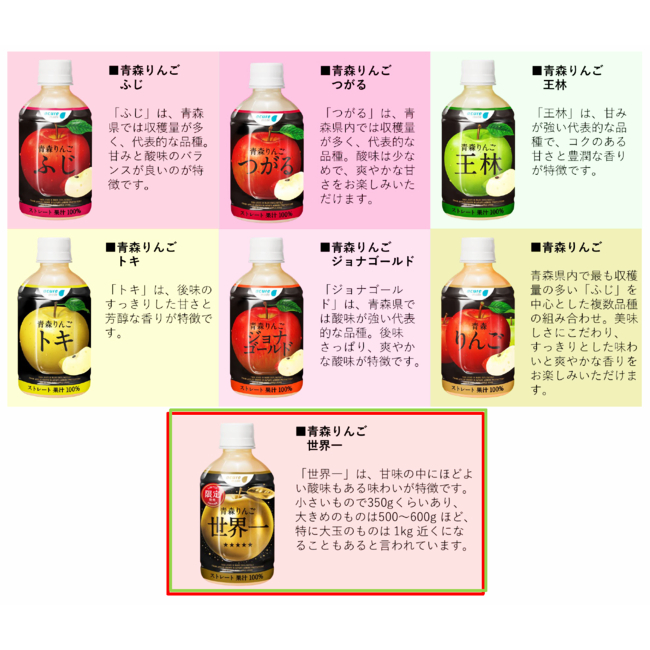 สึการุ เป็นแอปเปิลหวานสดชื่น ไม่ติดเปรี้ยวนัก เป็นน้ำแอปเปิลที่ดื่มง่ายและเป็นที่นิยมมาก, โอริน เป็นแอปเปิลเขียวที่แทบไม่มีรสเปรี้ยวเลย ให้รสหวาน รสสัมผัสเข้มข้น, โทคิ เป็นแอปเปิลรสหวานฉ่ำลิ้น ให้อาฟเตอร์เทสต์คลีน ๆ สดชื่น, โจนาโกลด์ เป็นแอปเปิลแดงให้รสเปรี้ยวแหลมกว่าแอปเปิลอาโอโมริพันธุ์อื่น, อาโอโมริริงโงะ เป็นเบลนด์น้ำแอปเปิลเด่น ๆ ของจังหวัด มีทั้งฮายาชิ โจนาโกลด์ และอื่น ๆ รวมกัน ทุกแบบที่ว่ามาราคาอยู่ที่ขวดละ 170 เยน หรือ 50 บาท (280 มล.)