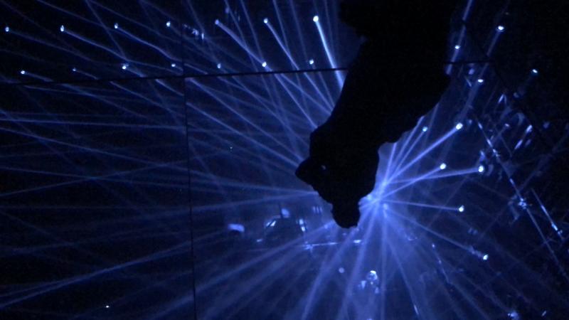 เดินเข้าไปครั้งแรกจะเจอกับทางเดินแคบและมืด มีเพียงแสงไฟส่องสว่างเบา ๆ เท่านั้นเพื่อทำการปรับสายตาของเราให้คุ้นเคยกับความมืดเสียก่อน ก่อนที่จะมาเจอกับจุดแรก "Waterfall of light Particles at the Top of an Inclide" ทางเดินลาดขึ้นที่มีน้ำตกขนาดใหญ่ ปล่อยน้ำลงมาให้ไหลไปตามทาง เราต้องเดินก้าวขึ้นตามทางลาดที่เต็มไปด้วยสายน้ำขึ้นไป พิพิธภัณฑ์เปิดประสบการณ์แรกให้เรารู้เลยว่า ด้านในเราจะต้องเจอกับอะไรบ้าง ทั้งสายน้ำที่ต้องลุย พื้นผิวของทางเดินที่ใช้วัสดุแตกต่างสลับกันไป นุ่มบ้าง แข็งบ้าง หนาบ้าง บางบ้าง กำมะหยี่ หนังบุ ให้เรารู้สึกเหมือนได้เดินบนพื้นผิวในแต่ละดาวที่แปลกกันออกไป ยิ่งใช้เท้าเปล่าเดินด้วยแล้วก็ยิ่งรู้สึกมากขึ้น แถมน้ำตกตัวนี้ยังเป็นกุศโลบายที่ดีในการทำความสะอาดเท้าของผู้เข้าชมในแต่ละคนก่อนเข้าไปลุยงานแต่ละชิ้นด้านในอีกด้วย (เพราะกลิ่นคลอรีนแรงเชียวแหละ)