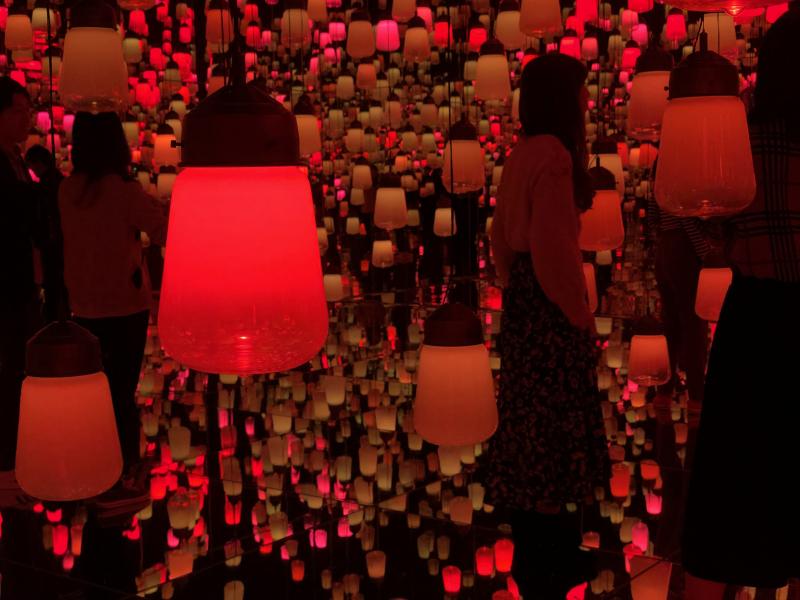 ความแตกต่างของที่นี่กับ Borderless คือที่ Planets จะต้องเดินไปตามทางที่กำหนดไว้ให้ ไม่ได้ให้เราค้นหาเส้นทางตามใจเองเหมือนอีกที่หนึ่ง นั่นจึงทำให้เขาสามารถวางรูทในการพบเจอแต่ละห้องแบบไหลลื่นต่อกันไปได้อย่างดี แต่ก็อาจขาดความอิสระในการค้นหาไปนิดหน่อย ที่นี่มีหลายห้องที่สนุกสนานมาก อย่างห้องแรก Soft Black Hole ห้องมืด ๆ ที่บุพื้นด้วยวัสดุคล้ายบีนแบ๊ก เราจะต้องเดินไปอย่างยวบยาบเหมือนตัวเองกำลังลอยอยู่กลางอวกาศ, ห้อง The Infinite Crystal Universe ที่คล้ายกับห้อง Crystal Room ที่โอไดบะ แต่ที่นี่จะเป็นกระจกทั่วทั้งหมด ทั้งพื้น เพดาน และผนังห้อง เลยยิ่งรู้สึกเหมือนเส้นแสงนี้มันเคลื่อนที่ไปอย่างไร้ขอบเขตเข้าไปอีก, หรือห้องชื่อยาวเหยียดอย่าง Expanding Three-dimensional Existence in Intentionally Transforming Space ที่อัดแน่นไปด้วยบอลลูนยักษ์ทั้งห้อง แถมยังเปลี่ยนสีไปได้เรื่อย ๆ อีกต่างหาก ลูกโป่งที่ลอยไปมา และเปลี่ยนสีไปตามลักษณะการเดินของผู้เข้าชม ก็ทำให้เราสนุกกับถ่ายรูปได้เยอะเลย