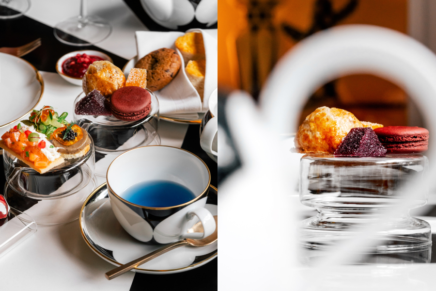 ส่วนขนมที่ทานคู่ชาก็น่าสนใจไม่แพ้กัน ในหมวด savory มีขนมที่อร่อยสุด ๆ อย่าง Quail & Whiskey Party Pie พายแป้งบางไส้เห็ด รสเค็มนิด ๆ Jerusalem Artichoke Panna Cotta พานนาคอตตาอาร์ติโชกให้รสชาติหอมมันเข้ากับความกรุบกรอบของขนมปังกรอบที่เป็นฐานล่าง King Salmon Crudo ขนมปังกรอบหน้าแซลมอนหั่นเต๋าและปู ราดด้วยน้ำยำรสเผ็ดเปรี้ยวตัดกัน และ Aperol Jube วุ้นองุ่นสีม่วงไว้ตัดรส