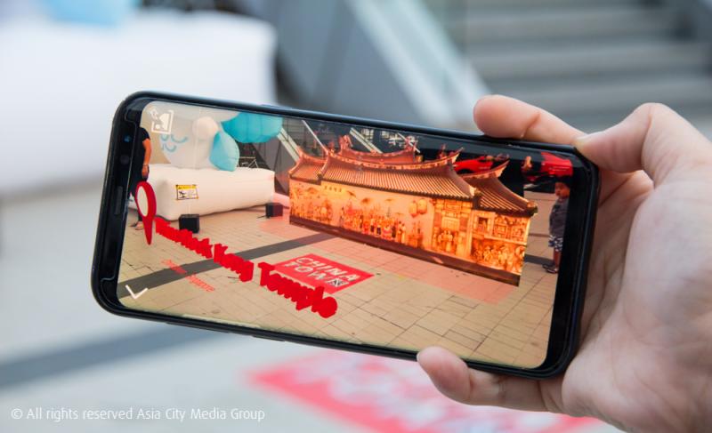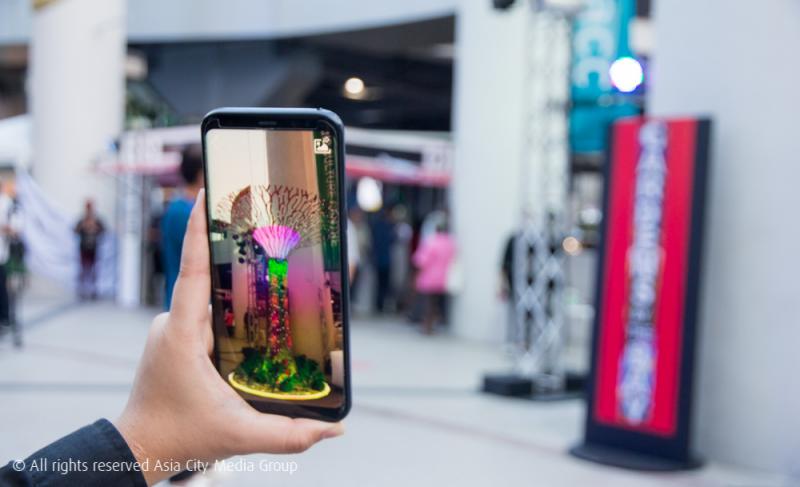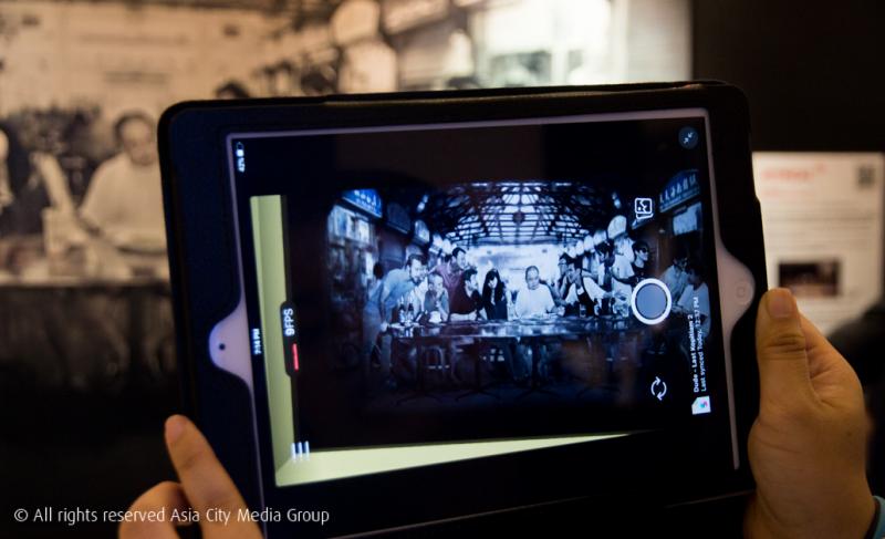 พื้นที่การจัดแสดงงานถูกแบ่งออกเป็นส่วนด้านหน้าอาคาร กับส่วนภายในอาคารที่บริเวณชั้น 1 เราว่าไฮไลต์ทั้งหมดมันถูกกองอยู่บริเวณด้านหน้าอาคารนี่แหละ เพราะพื้นที่ตรงนี้จะมีชุดผลงานศิลปะที่ผสานเทคโนโลยี AR (Augmented Reality) กระจายอยู่ทั่วพื้นที่ โดยจะมีโปสเตอร์และแผ่นป้ายที่ติดคำจากสถานที่ต่าง ๆ ในสิงคโปร์ เช่น China Town หรือ Haji Lane อยู่ เราเพียงแค่สแกน QR Code ที่กระจายอยู่บริเวณพื้นที่ ระบบก็จะเปิดกล้องของสมาร์ตโหนให้เรา จากนั้นก็เอากล้องไปส่องที่ภาพได้เลย ภาพสามมิติของสถานที่ท่องเที่ยวนั้น ๆ ก็จะปรากฎขึ้นมาทันทีแบบเก๋ ๆ ไปเลยจ้า ล้ำเวอร์