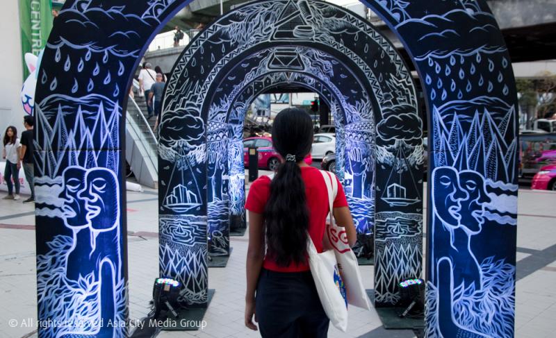 นอกจากนั้นยังมีผลงานต่าง ๆ ที่อยู่ภายใต้ชุดผลงานศิลปะ Atypical Singapore ที่มีทั้งงานศิลปะผสานเทคนิค AR, Installation และ Performance Art มาจัดแสดงทั้งด้านนอกและด้านในด้วย อย่างผลงานที่ดูคล้ายประตูอุโมงค์ที่ตั้งอยู่ด้านนอกในชื่อ S*GATTE โดย Speak Cryptic นั้นก็เป็นอีกหนึ่งชิ้นงานที่เราสามารถส่อง AR ได้เช่นกัน (จะเห็นน้องเมอร์ไลออนกำลังพ่นน้ำอยู่ด้วยนะ) ว่ากันว่าที่นี่เป็นดั่งประตูเข้าสู่สิงคโปร์ เพราะที่ประตูหยิบเอาสิ่งต่าง ๆ ของสิงคโปร์เข้ามาประกอบร่วมกันเต็มไปหมด และที่ผลงานนี้เป็นสีขาว-ดำเพราะตัวศิลปินนั้นเป็นคนตาบอดสีด้วยนั่นเอง