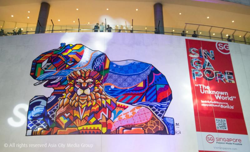 นอกจากนี้ยังมีผลางนชิ้นใหญ่สุดที่สแกนได้เหมือนกัน กับภาพฝาผนังที่จับมือกันระหว่างศิลปินสตรีทอาร์ตชาวไทยและสิงคโปร์อย่าง Rukkit-รักกิจ สถาพรวนา และ SKL0-แซมโล ที่จับเอาสัตว์สองชนิดจากสองประเทศอย่างสิงโต (ก็เมอร์ไลออนไงล่ะ) และช้าง สัตว์คู่บ้านของเรามาอยู่รวมกันนั่นเอง ใครแวะไปแถว BACC ก็อย่าลืมหยิบสมาร์ตโฟนของตัวเองสแกน QR Code แล้วส่องไปที่ภาพวาดนี้ด้วยล่ะ รับรองว่าจะเห็นสัตว์ทั้งสองตัวขยับเขยื้อนมีชีวิตแน่นอน!