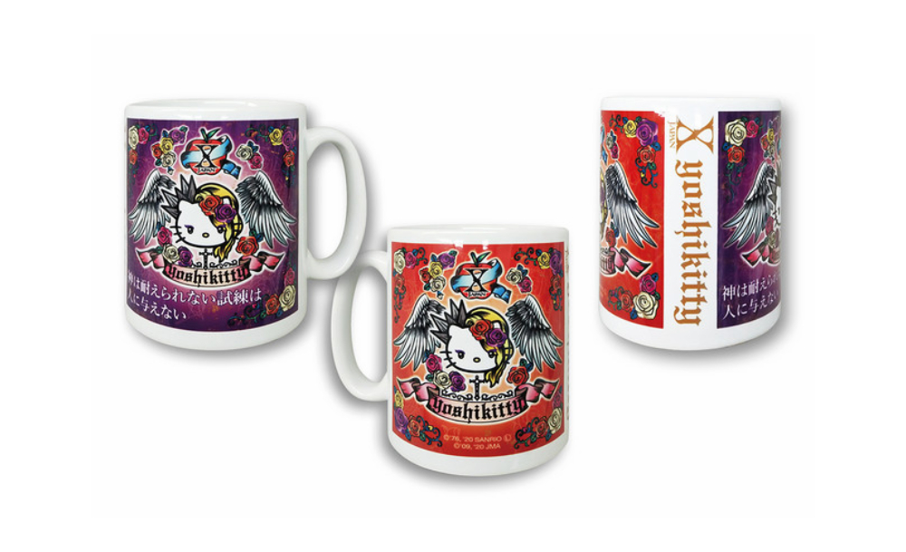 แก้วมัคลาย Yoshikitty Tsubasa มีมาแบบเดียวถ้วน ประกอบด้วยกราฟิกสีแดงและม่วงในแต่ละด้านของตัวแก้ว และสกรีนส่วนรอยต่อระหว่างภาพกราฟิกด้วยคำว่า X Japan Yoshikitty ถือว่าเป็นภาชนะใส่เครื่องดื่มที่ดีไซน์หนักหน่วงเกินต้านทีเดียว สนนราคาอยู่ที่ 2,200 เยน (660 บาท) จ้า!